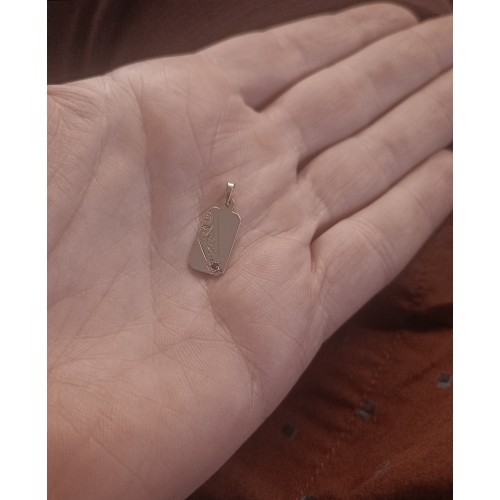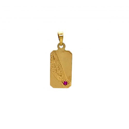 Zlatý přívěsek destička s rytinou ve žlutém zlatě osazená červeným zirkonem kulatého brusu o průměru 1 mm. Jedná se o opticky decentní zlatý přívěsek, jenž nejlépe vynikne na slabém zlatém řetízku.