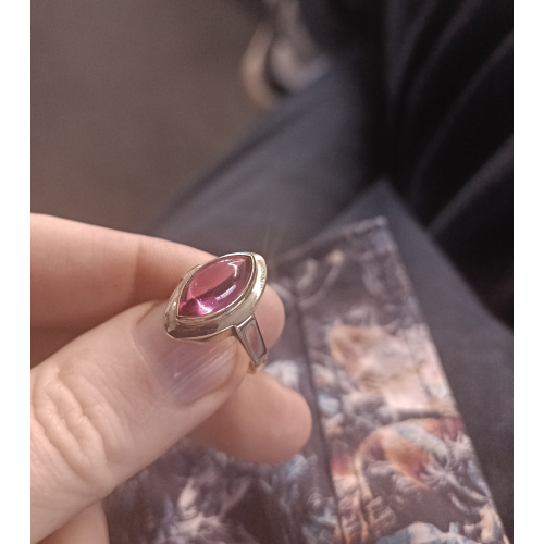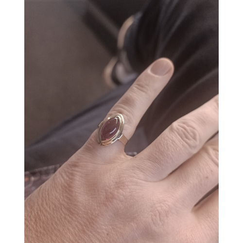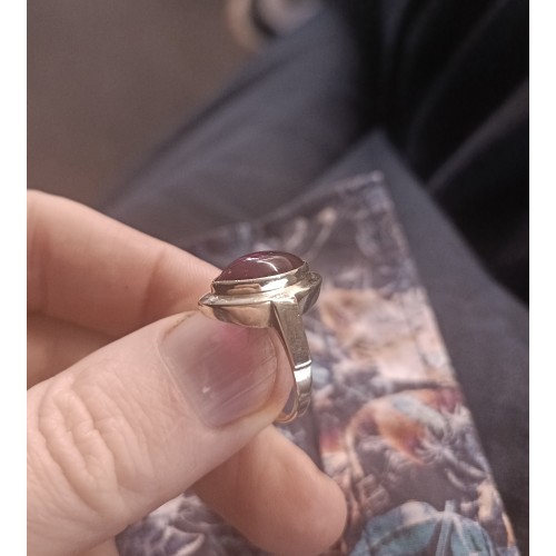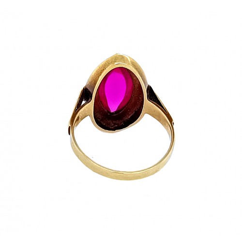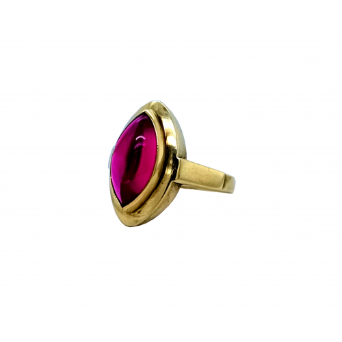 Bazarový zlatý prsten ručně vyrobený ze silného zlatého materiálu (vydrží léta a nebude se deformovat) ve žlutém zlatě. Šperk byl nošen je v dobrém stavu bez výrazného poškození. Prstýnek byl osazen červeným kamenem v čočkovém brusu o rozměru 14 x 7,5 mm.