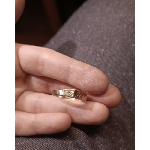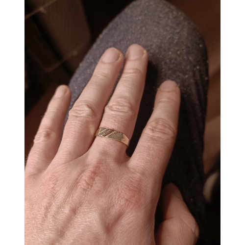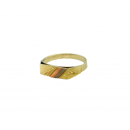 Bazarový pánský zlatý prsten vyrobený v kombinaci žlutého, bílého a červeného zlata. Šperk byl nošen je ve velmi dobrém stavu bez výrazného poškození. Ručně vyrobený i gravírovaný prstýnek v praktickém designu.