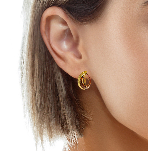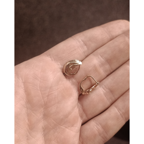 Dámské ručně montované visací náušnice ze žlutého a červeného zlata bez kamínků zdobené decentní rytinou. Šperk byl vyroben v kombinaci matné a lesklé povrchové úpravy a perfektně se hodí na denní nošení. Opticky se jedná o střední zlaté náušnice viz rozměry s uzávěrem na klapku.