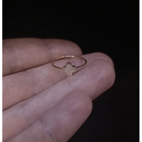 Dámský zlatý prsten čtyřlístek ze žlutého zlata. Velice pěkný prsten osazený čirým zirkonem kulatého brusu o průměrech 1 mm. Opticky jemnější prsten v moderním designu.