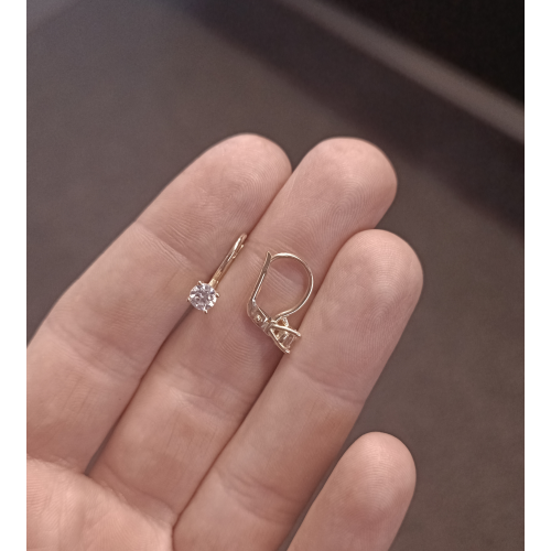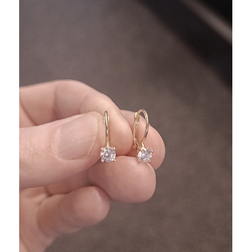 Drobnější zlaté dámské visací náušnice osazené čirým zirkonem kulatého brusu o průměru 4,5 mm. Náušnice jsou vyrobené v lesklé povrchové úpravě s klasickém uzávěrem na klapku a opticky působí středně masivně viz rozměry.