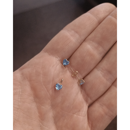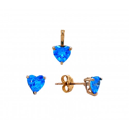 Zlatá souprava náušnic a přívěsku osazená světle modrým zirkonem vybroušeným do tvaru srdíčka ve žlutém zlatě. Jedná se o opticky jemný zlatý set v decentním provedení. Zlaté náušnice mají uzávěr na puzetku a přívěsek lze ideálně kombinovat s jemným zlatým řetízkem.