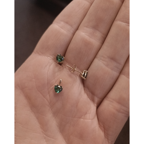 Zlatá souprava náušnic a přívěsku osazená zeleným zirkonem vybroušeným do tvaru srdíčka ve žlutém zlatě. Jedná se o opticky jemný zlatý set v decentním provedení. Zlaté náušnice mají uzávěr na puzetku a přívěsek lze ideálně kombinovat s jemným zlatým řetízkem.
