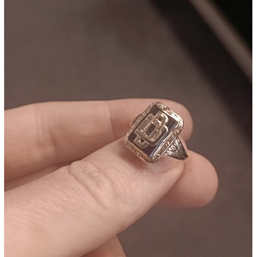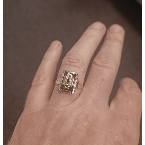 Starožitný unisex prsten ze žlutého zlata osazený černým onyxem o rozměru cca 12 x 8 mm a po obvodu zdobený precizní ruční rytinou. Šperk je puncován státním punce se lvíčkem (punc je používaný v letech 1929 - 1949). Ručně vyrobený i gravírovaný šperk v pěkném stavu bez výrazných známek nošení nebo poškození.