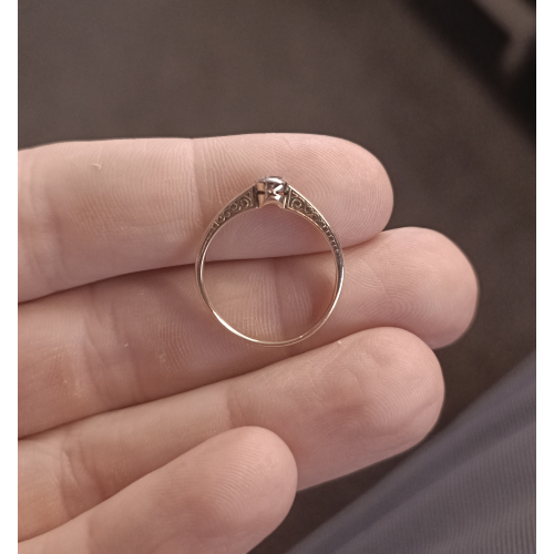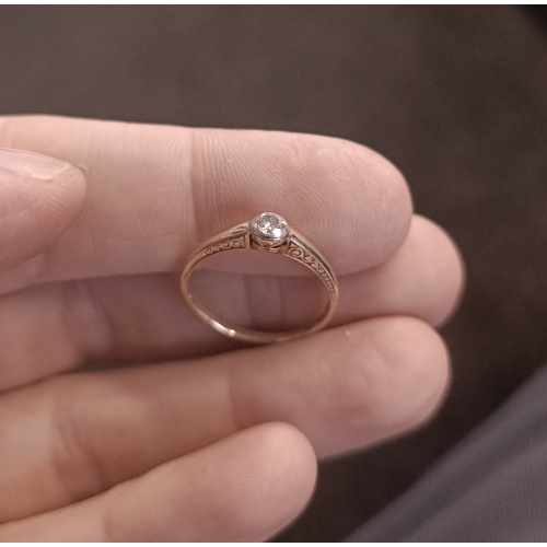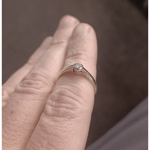 Starožitný zlatý prsten v kombinaci žlutého a bílého zlata, osazený briliantem kulatého brusu o průměru cca 3,85 mm (cca 0,16 ct). Přírodní diamant má pěknou brilanci a je opticky bílý. Prsten je značený státním punce se lvíčkem (punc je používaný v letech 1929 - 1949) a je v pěkném stavu bez výrazných známek nošení nebo poškození. Jedná se o zdařilou zlatnickou práci.
