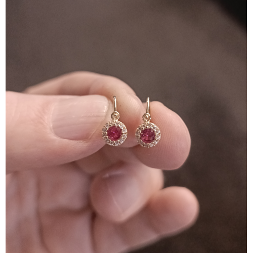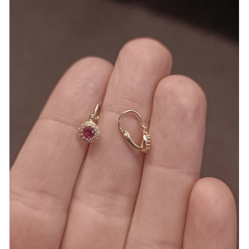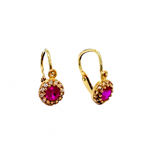 Zlaté dětské náušnice ve žlutém zlatě osazené centrálním červeným a menšími čirými zirkony, 1x 3 mm (červený) a 12x 1 mm (čirý). Velice pěkné a moderní dětské náušnice v krásném provedení.