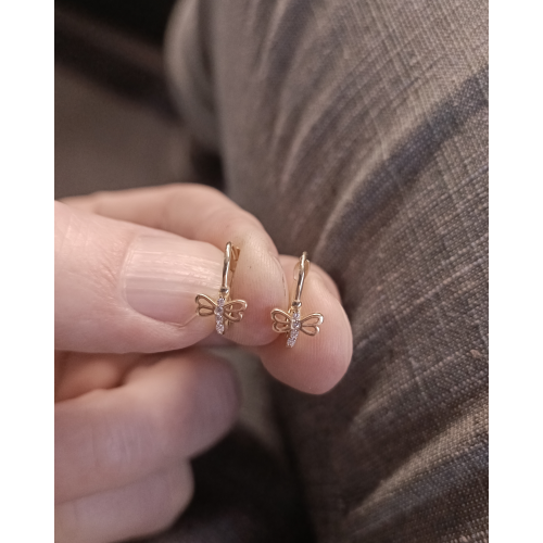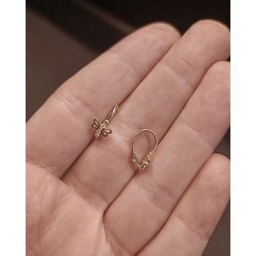 Zlaté dívčí - dětské náušnice vážky ve žlutém zlatě. Zlaté náušnice mají uzávěr na klapku a jsou osazeny čirými zirkony kulatého brusu o průměru 1 mm. Jedná se o větší dětské náušnice, které se hodí i jako dámské, ale budou působit spíše drobněji.