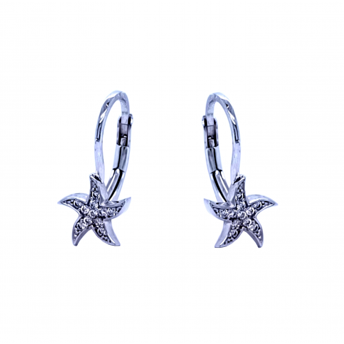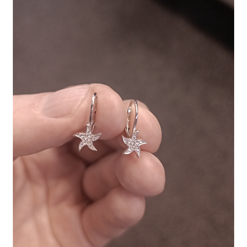 Zlaté dámské visací náušnice hvězdičky v bílém zlatě osazené drobnými čirými zirkony. Zlaté náušnice se hodí jak pro ženy tak i pro náctileté slečny. Moderní náušnice v mladistvém provedení.