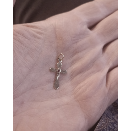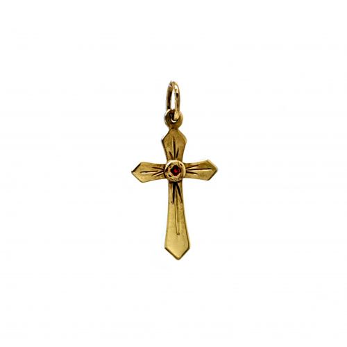 Zlatý přívěsek retro křížek zdobený ruční rytinou a osazený červeným kamínkem o průměru 1 mm. Přívěsek byl nošen, ale je ve velmi dobrém stavu (jako nový) bez výrazných známek nošení nebo poškození. Tento zlatý ručně vyrobený šperk se hodí do kombinace s jemnějším zlatým řetízkem.